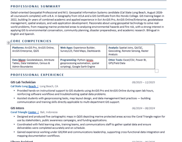 I care about making maps that are actually useful, not just visually impressive. Whether I'm supporting environmental conservation, disaster preparedness, or academic research, my goal is to translate complex spatial data into clear insights that help people make better decisions. I am bilingual in English and Spanish.