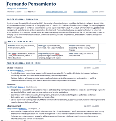 I'm Fernando Pensamiento, a California-based geospatial professional completing my M.S. in Geospatial Information Systems at Cal State Long Beach, with a B.A. in Geography from UCLA. I specialize in spatial analysis, cartography, remote sensing, and web mapping, building data-driven solutions that support environmental analysis, community planning, and informed decision-making.