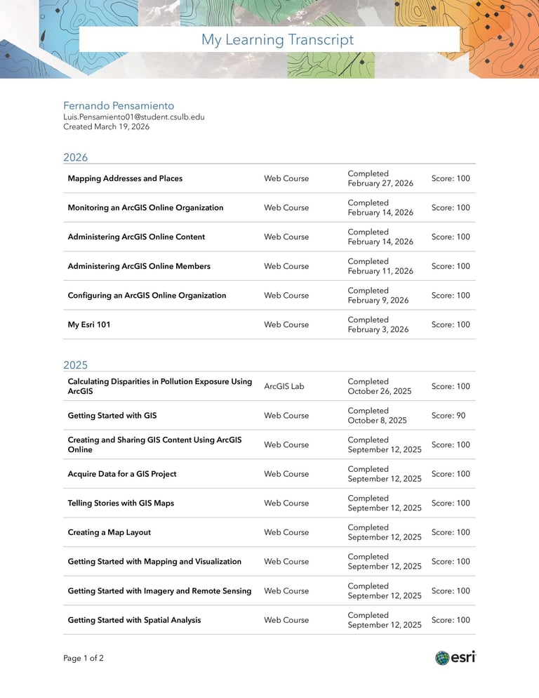 Hi, I’m Fernando Pensamiento. I’m a GIS graduate student focused on building reliable GIS datasets and clear map products that support real-world decision-making. I have developed a strong foundation in spatial analysis, remote sensing, cartography, and geospatial data visualization, data collection, data cleaning/QA/QC and publishing interactive web maps and dashboards.