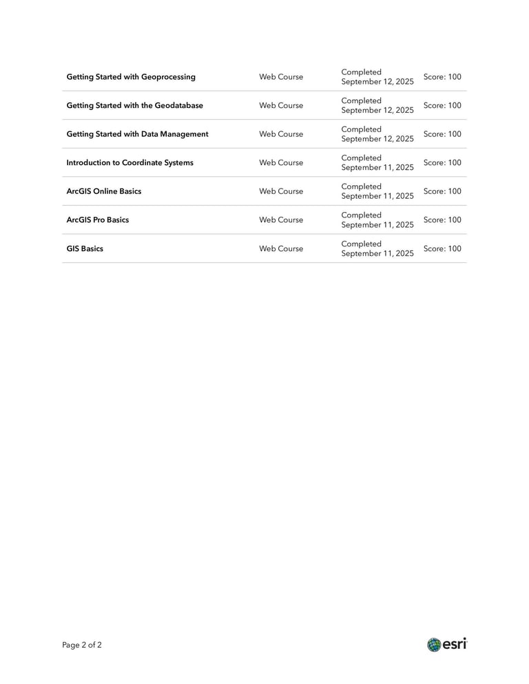 Recently, my projects have combined Survey123 field-style data collection with ArcGIS Online/Enterprise hosting, Experience Builder applications, and dashboards for public-facing communication. I’m also expanding my remote sensing skills and using Python to automate geoprocessing and improve repeatability and data accuracy. I am continuously expanding my skills and exploring new ways GIS can contribute to solving real-world challenges.
